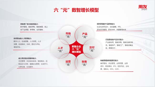基于對典型客戶的分析,結(jié)合知名管理理論和過往實(shí)踐,用友將成長型企業(yè)經(jīng)營管理的基本要素進(jìn)一步抽象,以“元”為初始,重磅推出了全新的企業(yè)價(jià)值模型,即六“元”數(shù)智增長模型。
