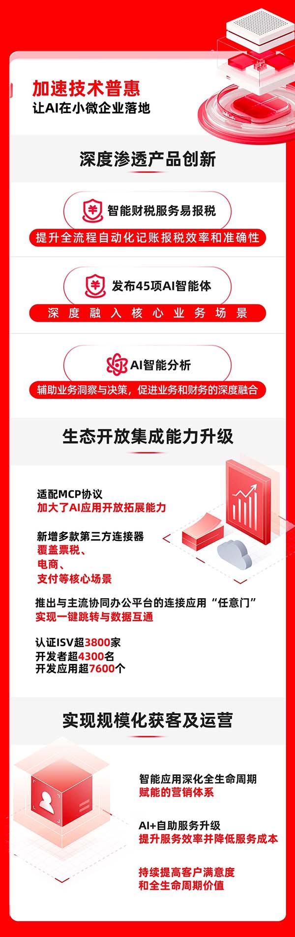 報告期內,暢捷通加速推動AI技術在小微企業(yè)的深度落地,通過新一代企業(yè)級AI原生應用開發(fā)平臺,不斷優(yōu)化產品體驗與效能。為微型企業(yè)提供全流程智能化記賬報稅的智能財稅服務易報稅,借助于AI技術的發(fā)展和對財稅垂直大模型的持續(xù)訓練,效率及準確性進一步提升,同時開啟高效業(yè)務拓展模式,為該業(yè)務的規(guī)模化推廣打下堅實基礎。暢捷通還發(fā)布了45項AI智能體應用,覆蓋多條產品線,深度融入核心業(yè)務場景,全方位提升企業(yè)經營效率。