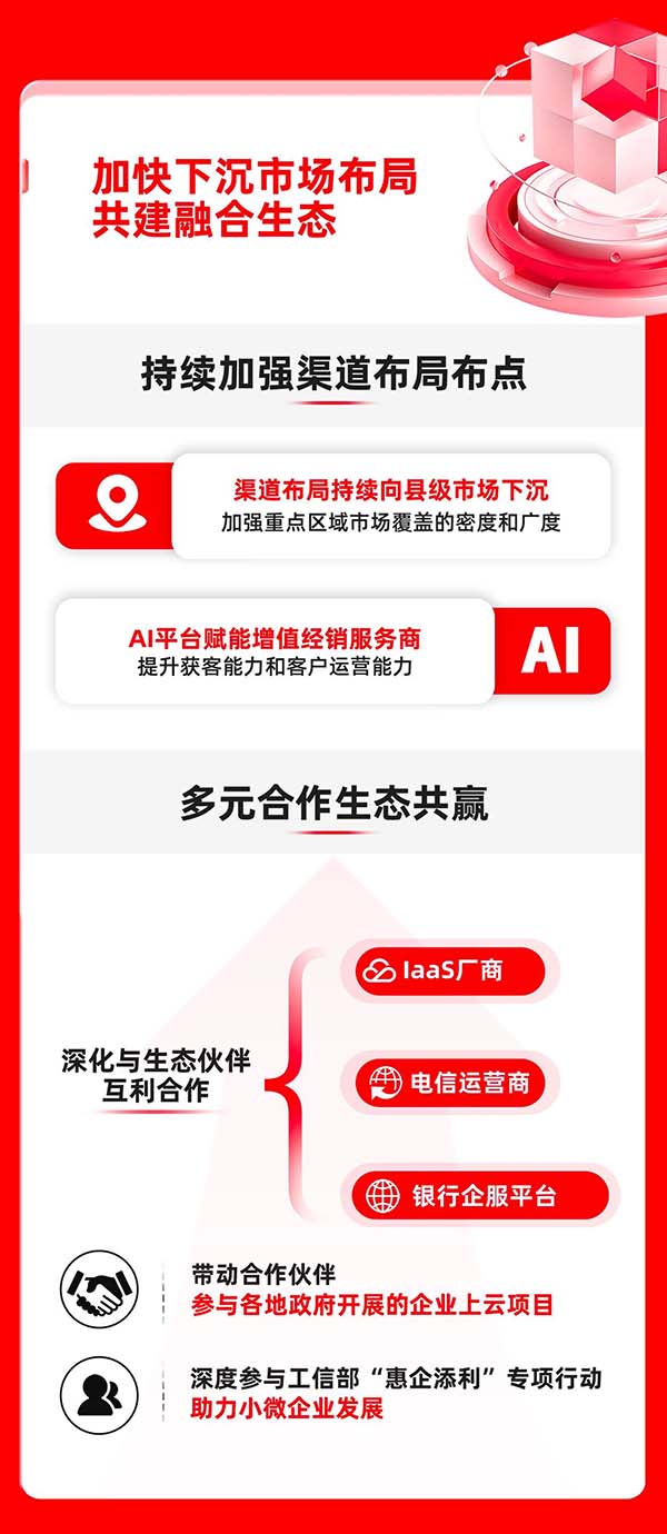 與此同時,暢捷通深化與電信運營商、華為云等IaaS廠商、銀行企服平臺的互利合作,形成資源互補、場景互通的生態(tài)合作網絡。