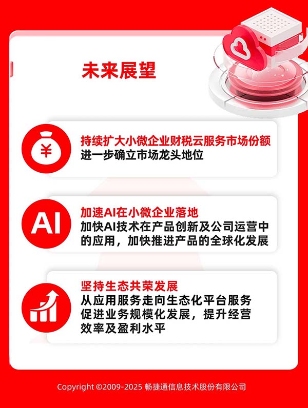 未來,暢捷通將持續(xù)擴大小微企業(yè)財稅云服務市場份額,進一步鞏固小微企業(yè)財稅云服務市場龍頭地位,搶占小微企業(yè)云服務市場龍頭地位,堅定秉持客戶成功原則,持續(xù)提升產品競爭力,加快推進產品的全球化發(fā)展。與此同時,暢捷通將加速AI在小微企業(yè)落地,加快AI技術在產品創(chuàng)新及公司運營中的應用,堅持生態(tài)共榮發(fā)展,從應用服務走向生態(tài)化平臺服務,促進業(yè)務規(guī)模化發(fā)展,提升經營效率及盈利水平。