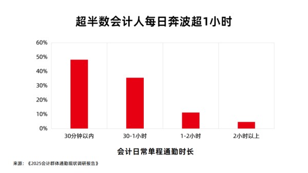 通勤不僅消耗時(shí)間,更直接影響工作狀態(tài)。62% 的會(huì)計(jì)人認(rèn)為“通勤時(shí)間越長,工作效率越低”,到崗后需要額外時(shí)間“回血”才能投入工作。