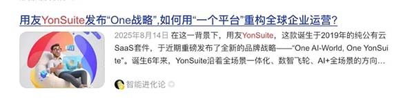 它提出的“雙One”,既是對(duì)未來的宏大描繪,也是對(duì)自身角色的精準(zhǔn)定位:One AI-World,勾勒AI驅(qū)動(dòng)的新商業(yè)世界;One YonSuite,宣示成為全球成長(zhǎng)型企業(yè)最優(yōu)核心平臺(tái)的決心,也意味著一次 All-in-ONE 的戰(zhàn)略升級(jí)。