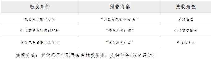 IF 投標(biāo)截止時間 < NOW() AND 投標(biāo)數(shù) < 3 THEN 發(fā)送預(yù)警