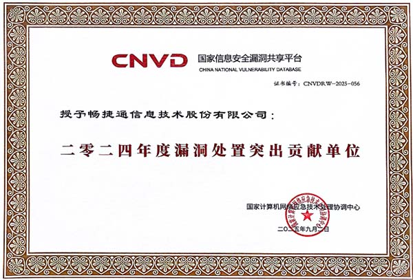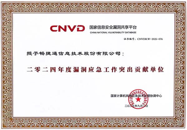 憑借成熟的安全管理體系和規(guī)范化的安全運(yùn)營能力,用友暢捷通榮獲“CNVD漏洞處置突出貢獻(xiàn)單位” 與 “CNVD漏洞應(yīng)急工作突出貢獻(xiàn)單位” 兩項(xiàng)國家級榮譽(yù)。這不僅是對暢捷通在網(wǎng)絡(luò)安全領(lǐng)域?qū)I(yè)能力的權(quán)威認(rèn)可,也體現(xiàn)了在保障客戶數(shù)據(jù)安全、筑牢數(shù)智防線方面的持續(xù)投入與扎實(shí)成果。