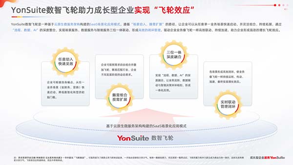 用友YonSuite創(chuàng)新提出的數(shù)智飛輪3.0場景化應(yīng)用方案,正是為解決這一困境而生。這是一種基于云原生微服務(wù)架構(gòu)構(gòu)建的SaaS創(chuàng)新應(yīng)用模式,遵循場景切入,隨需擴(kuò)展的路徑,讓企業(yè)可以從任意單一業(yè)務(wù)場景快速啟動,并靈活組合、持續(xù)拓展,通過“流程×數(shù)據(jù)×AI”的深度融合,實(shí)現(xiàn)場景服務(wù)、數(shù)據(jù)服務(wù)與智能服務(wù)三位一體聯(lián)動,形成高效的閉環(huán)管理,驅(qū)動企業(yè)業(yè)務(wù)像飛輪一樣高效聯(lián)動、持續(xù)加速,助力企業(yè)形成強(qiáng)勁的增長飛輪效應(yīng)。