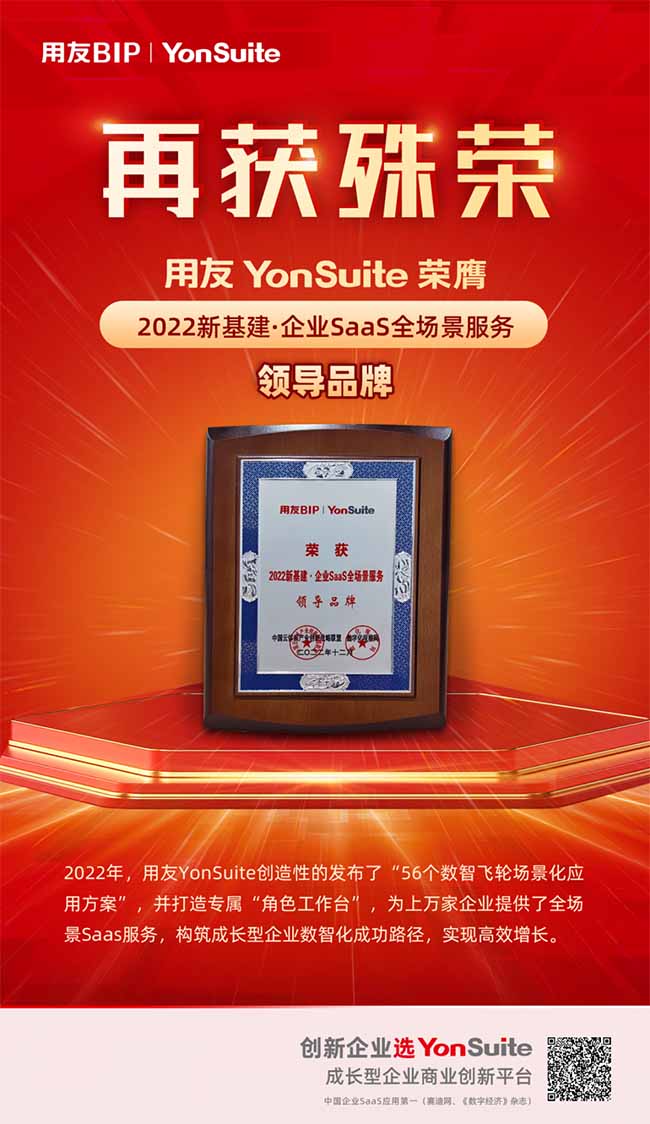 本次評選用友YonSuite榮獲“2022新基建·企業(yè)SaaS全場景服務領導品牌”,以實力引領創(chuàng)新,以技術領先性和創(chuàng)新性驅(qū)動企業(yè)高效增長,領跑中國SaaS產(chǎn)業(yè)發(fā)展。