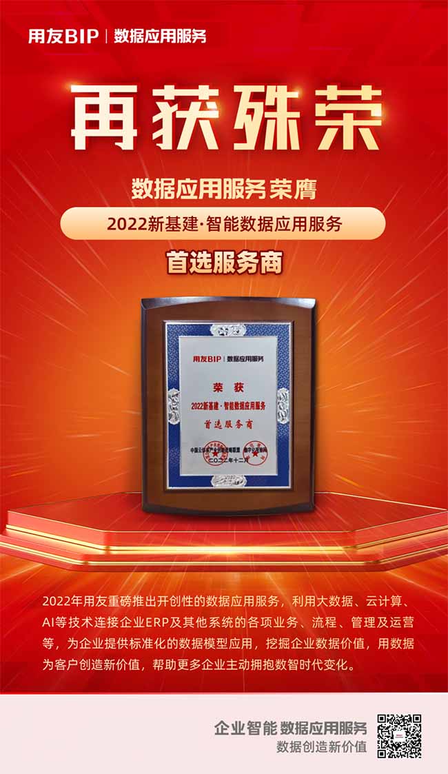 用友數(shù)據(jù)應用服務憑借著先進的技術架構(gòu)、創(chuàng)新的應用模式和優(yōu)秀的客戶實踐,榮獲“2022新基建·智能數(shù)據(jù)應用服務首選服務商”獎項。